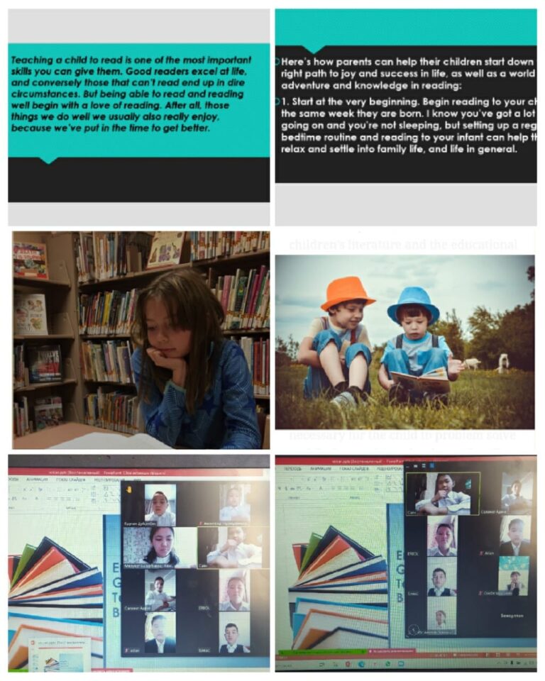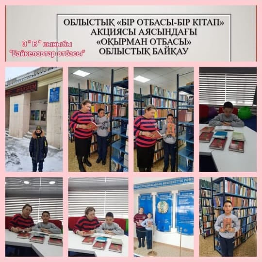 Қарағанды облысының білім басқармасының Жезқазған қаласының білім бөлімінің «Кеңгір селосының # 2 ЖББМ» КММ-нің 3 «Б» сынып Байкеловтар отбасының «Оқырман отбасы» байқауына қатысқан сәтінен фотоколлаж