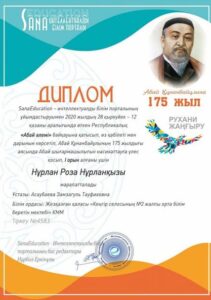2020 жылдың 27-қазанында «Кеңгір селосының №2 ЖОББМ» КММ-нің «Бір отбасы – бір кітап » жобасы аясында ZOOM платформасымен Абайдың «Он бесінші қарасөзіне» талдау жасалды