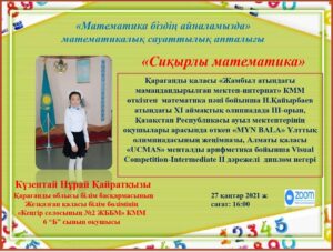 «Кеңгір селосының № 2 ЖОББМ-інде «Зейін» жобасы аясында «МАТЕМАТИКА БІЗДІҢ АЙНАЛАМЫЗДА» математикалық сауаттылық апталығының жоспарына сәйкес, 27.01.2021 жылы жоғары сынып оқушыларымен «Өнегелі өмір» жобасы аясында «Сиқырлы математика» тақырыбында мектебіміздің мақтанышы 6 «б» сынып оқушысы Күзентай Нұраймен кездесу ұйымдастырылды. Кездесуге бастауыш сынып оқушылары қатысты. Мақсаты: Бастауыш сынып оқушыларына жоғары сынып оқушыларымен кездесу ұйымдастыру арқылы бүлдіршіндердің оқуға деген ынтасын, математика пәніне деген қызығушылықтарын арттыру.