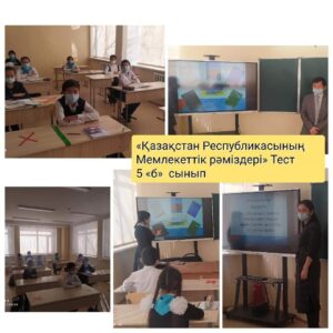 Қарағанды облысының білім басқармасы,Жезқазған қаласының білім бөлімі, «Кеңгір селосының N2 ЖББМ» КММ -сінде 2021 жылдың 9-шы ақпан күні «Құқықтық навигатор» апталығы аясында 5 сыныптармен мектепте жəне қашықтықтан оқитын 6-7 сыныптармен ZOOM платформасы арқылы құқық пəнінің мұғалімі Ғ.И.Боранов жəне сынып жетекшілері «Қазақстан Республикасының Мемлекеттік рəміздері» тақырыбында тест жүргізді.