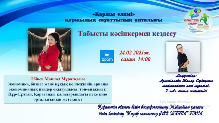 Қарағанды облысы білім беруді дамытудың оқу-әдістемелік орталығының ұйымдастыруымен Кеңгір селосының N2 жалпы білім беретін мектебінде «Қаржы əлемі» атты қаржылық сауаттылық апталығының жоспарына сәйкес «Кездесулер, саяхаттар» циклы аясында 2021 жылдың 24-ші ақпанында «Əлеуметтік серіктестіктер» тақырыбында 11 сынып оқушыларымен Жезқазған қаласының жас бизнесмені, «Атамекен» кəсіпкерлер Палатасының «Бастау» бизнес курсы Грантының иегері, New Bite программалау мектебінің басшысы Тілеукен Темірлан Бағдатұлымен ZOOM платформасы арқылы кездесу өткізілді. Іс-шараны 11 «А» сынып жетекшісі К.Ж.Бағланова ұйымдастырды.