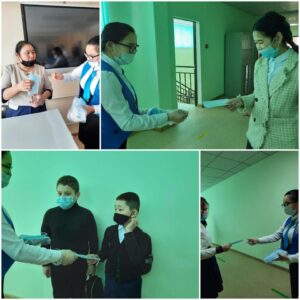 «Кең болсаң, Кем болмайсын» ұранымен 15 Жас Ұландық, 1-4, 5, 9 сынып оқушыларына 37 маска, 4 мектеп мұғалімдеріне, 3 мектеп тазалық қызметкерлеріне және 6 көшеде маскасыз жүрген ауыл тұрғындарына маска таратты.