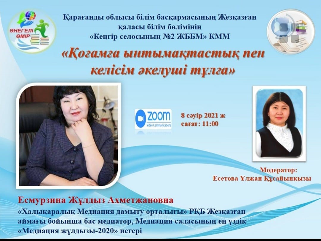 «Кеңгір селосының №2 ЖББМ» КММ-де облыстық «Өнегелі өмір» жобасы жоспарына сай 2021 жылдың 8 сәуірі күні «Қоғамға ынтымақтастық пен келісім әкелуші тұлға» тақырыбында "Халықаралық Медиация орталығының"- Жезқазған аймағы бойынша бас медиаторы, 2017 жылы Қарағанды облысы бойынша " Ең үздік медиатор", 2019 жылы Медиация саласының ең үздік медиаторы, "Медиация жұлдызы -2020", ІІ-ші дәрежелі кәсіби медиатор Есмурзина Жұлдыз Ахметжановнамен онлайн кездесу өтті. Бұл кездесуге мектебіміздің ұстаздары,7-11 сынып оқушылары, қала мектептерінің оқушылары қатысты. Сұхбат барысында оқушылар өздерін қызықтырған сұрақтарын қойып, сұрақтарына шынайы және нақты жауап алды. Мамандық таңдау бойынша кеңестер айтылды. Қонағымыздан өнегеге толы кеңестер алынды.