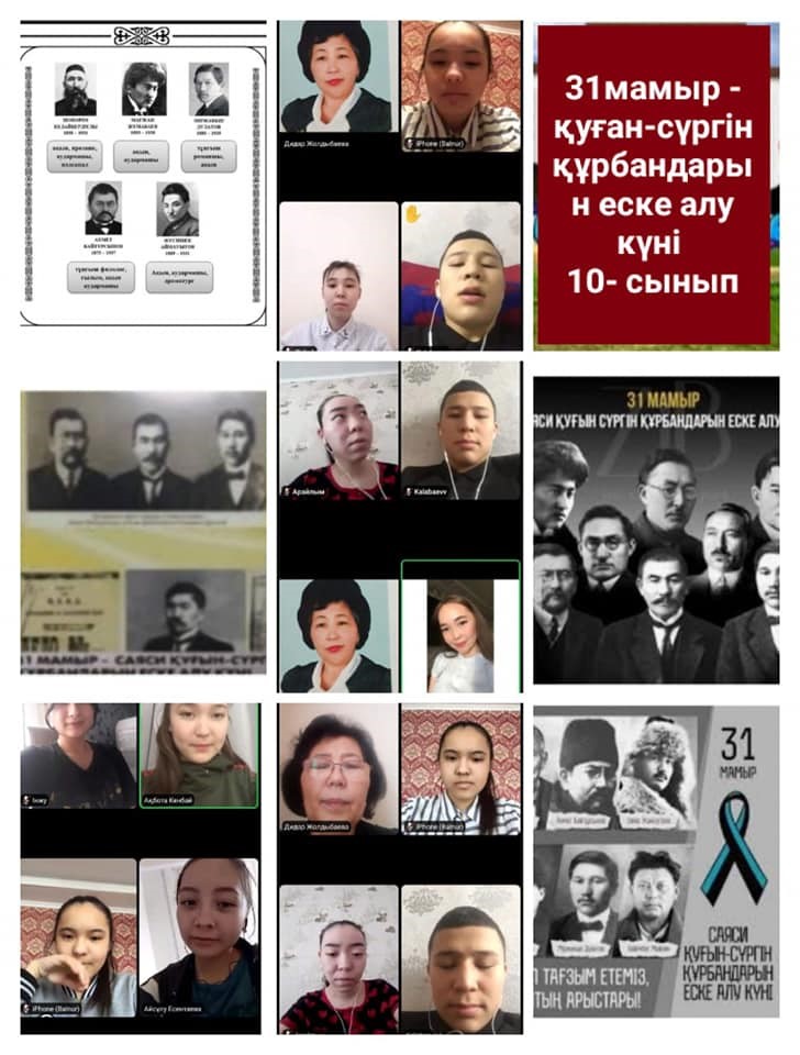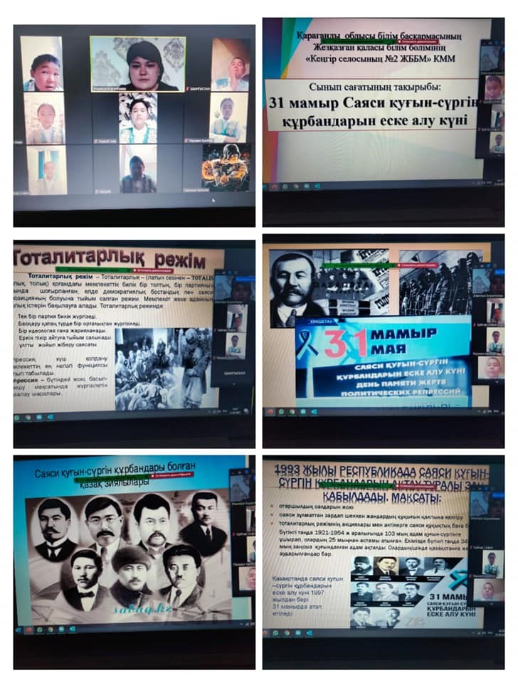 "Кеңгір селосының N2 ЖББМ"КММ-нің 1-11 сынып оқушыларымен 31мамыр-Саяси қуғын-сүргін жəне ашаршылық құрбандарын еске алу күні қарсаңында онлайн форматта сынып сағаттары өткізілді.Мақсаты:жас ұрпақты өз елінің тарихын білуге насихаттау, қазақ зиялылары туралы тың мəлімет беру жəне рухани адамгершілікке тəрбиелеу.