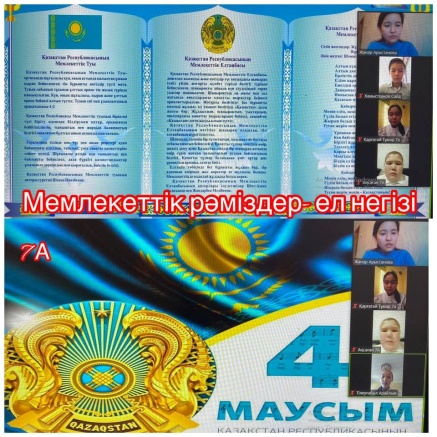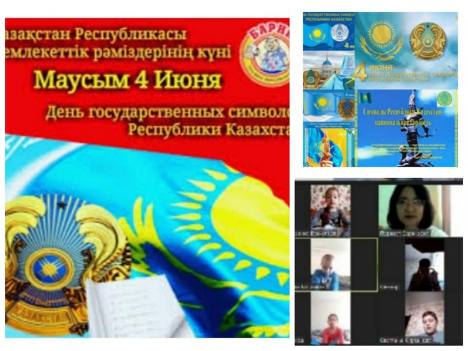 Қарағанды облысының білім басқармасы Жезқазған қаласының білім бөлімі "Кеңгір селосының № 2 ЖББМ" КММ -нің оқушыларымен 4 маусым - ҚР Мемлекеттік рəміздер күні не арнап онлайн форматта "Мемлекеттік рəміздер-ел негізі" тақырыбында сынып сағаттары өткізілді.Мақсаты: жас ұрпақты Мемлекеттік рəмізді құрметтеуге, отансүйгіштікке тəрбиелеу,патриоттық сезімдерін арттыру.