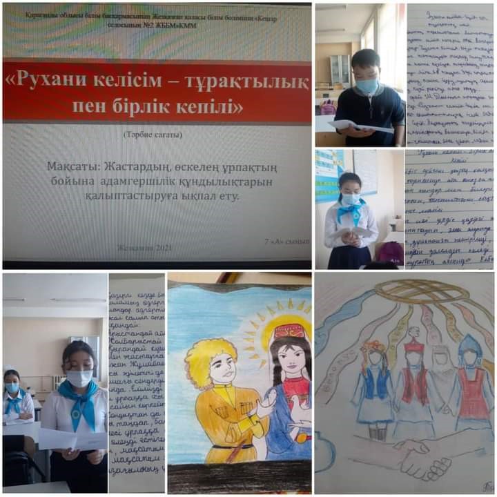 «Кеңгір селосының №2 ЖББМ» КММ-де 18 қазан – Рухани келісім күні қарсаңында 2-8 сынып аралығында «Рухани келісім тұрақтылықтың іргетасы» тақырыбында сыныптан тыс сағаттары өткізілді. Мақсаты: Өскелең ұрпақтың бойында рухани адамгершілік құндылықтары мен білім жүйесін дамытып қалыптастыру.Ұлтаралық достық қарым-қатынас пен қоғамдық тұрақтылықты сақтауға тәрбиелеу.