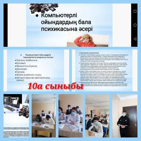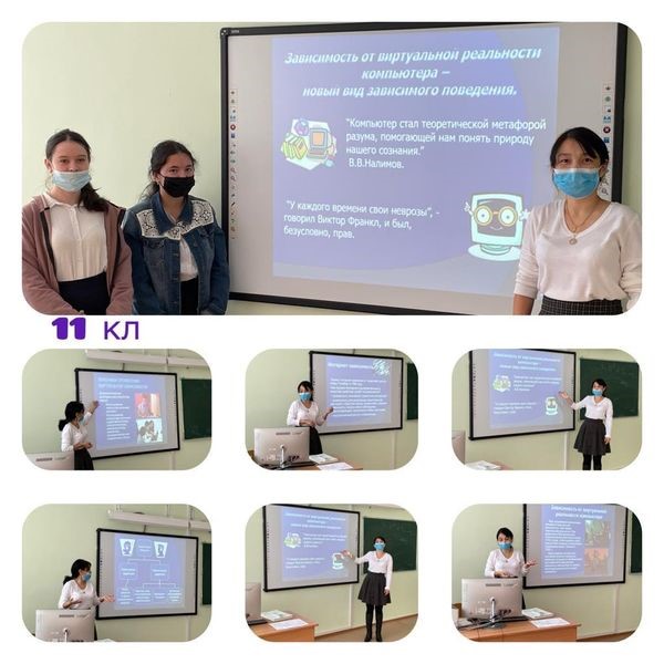 9-11 сынып арасында «Компьютерлік тәуелділіктің, виртуалды әлемге әуестенудің қауіптері» дөңгелек үстел ұйымдастырылды. Оқушылар өз үй жағдайларында интернетті қалай қолданатындарың айтып өтті. Тақырып бойынша презентация көрсетіліп, пікір алысып, түсіндіру жұмыстары жүргізілді.